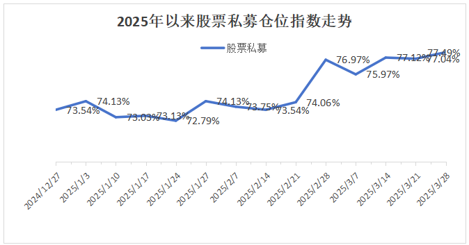 私募排排网最新数据显示,截至3月28日,股票私募仓位指数为77.49%,较前一周的77.04%上涨0.45个百分点,刷新今年以来的最高水平。