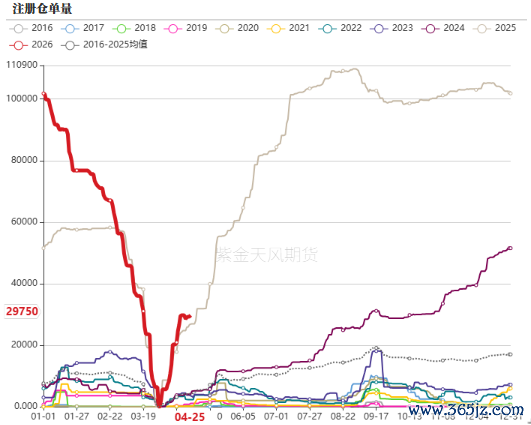 注册仓单增加。4月25日仓单量为29750,较上周增40张。