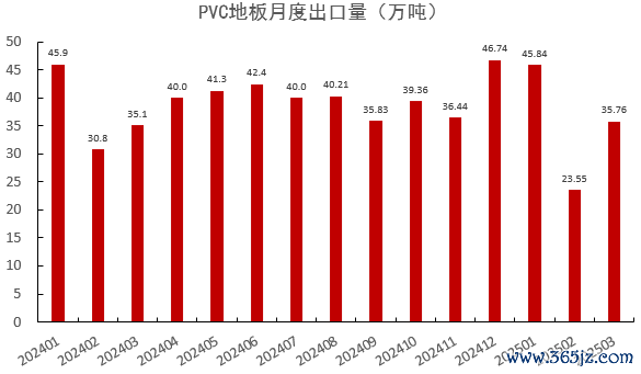 今年1-3月地板累计出口105万吨,同比下滑30.6%。