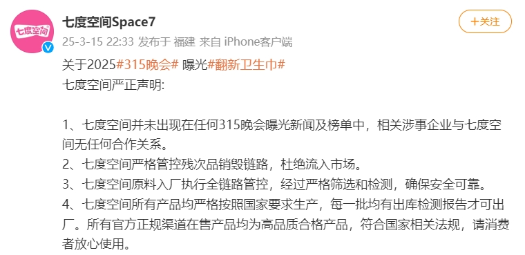 举报 相关阅读3·15晚会曝光翻新卫生巾,七度空间:与涉事企业无合作,严格管控残次品销毁链路