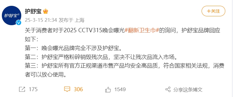 80 03-15 23:02护舒宝回应翻新卫生巾:严格粉碎销毁残次品,所有官方正规渠道市售产品均安全高品质
